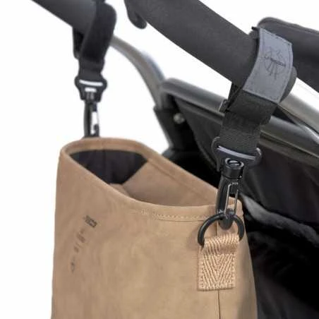Vaunulaukku sisältää tarranauhalla kiinnitettävät kiinnityskoukut, jolla laukun saa kiinnitettyä näppärästi vaunujen työntöaisaan.